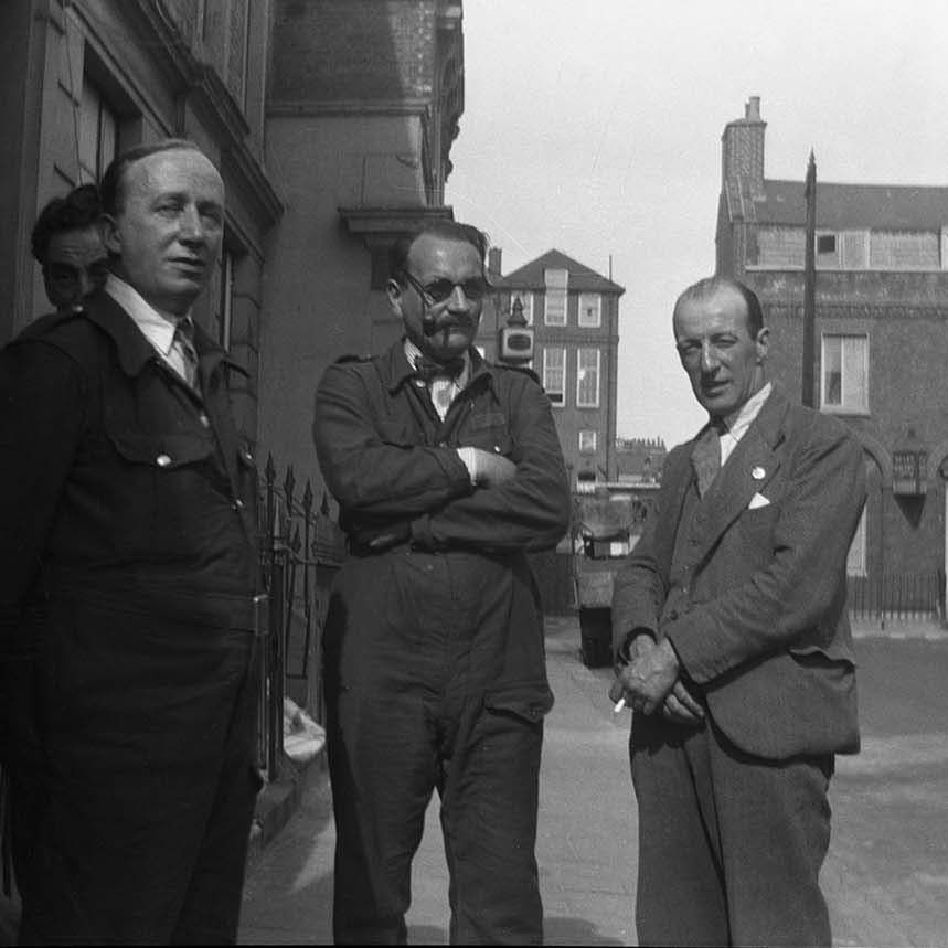 I’ve posted this image before, for my mini-bio of John Delamain Crocker (he’s the one with pipe). June S, my ambulance-driving diarist, captioned the photo “Dodd Crowley Crocker and ?”, which by my estimation makes the man in the ARP overalls Bernard Crowley. The 1911 census shows him living at 239 King’s Road with his father, grandmother and two sisters (he was actually one of nine surviving siblings). Those premises are now occupied by the clothes company L.K. Bennett.