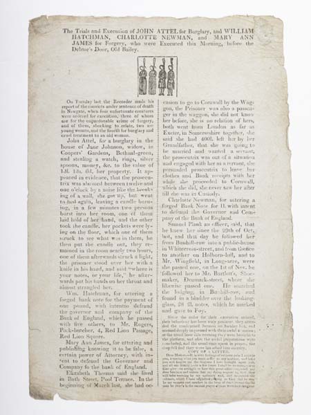 In the archives of the Bank of England is a note to the effect that the Bank would not oppose Charlotte Newman’s request to plead guilty to the lesser offence of possession. After all, a plea bargain of this kind was not uncommon. The Bank wanted a certain degree of public retribution – it was meant to deter others – but not so much as to encourage their critics. It may have been the judge, William Garrow, who insisted on the charge.