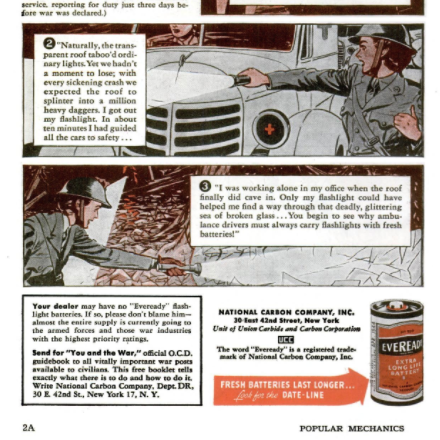 Then I googled her name with the word ‘ambulance’ and found this ad for EverReady batteries from the magazine Popular Mechanics (Nov 1943), in which “pretty, attractive 30-year-old Miss Bridges” of the London Auxiliary Ambulance service explained to American readers why batteries were crucial to her work. And I learned details about what happened on the night of 16 April 1941, when the glass roof of the ambulance station was shattered by bombs, irretrievably, it turned out. Plus we have a photo of Margaret, albeit a small one, in her ‘tin’ hat.